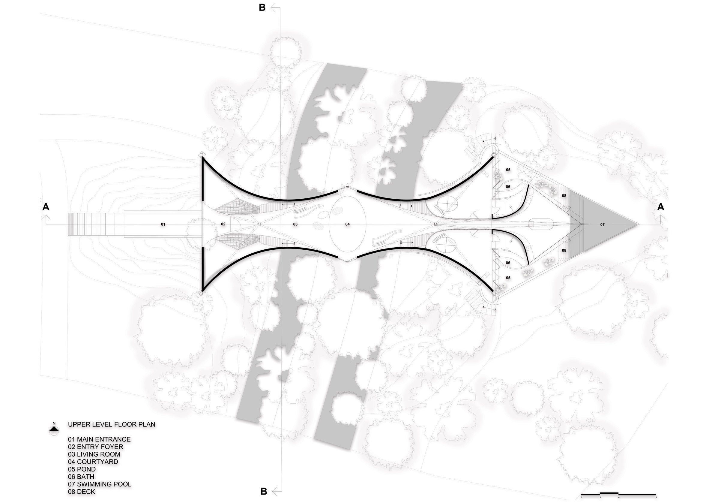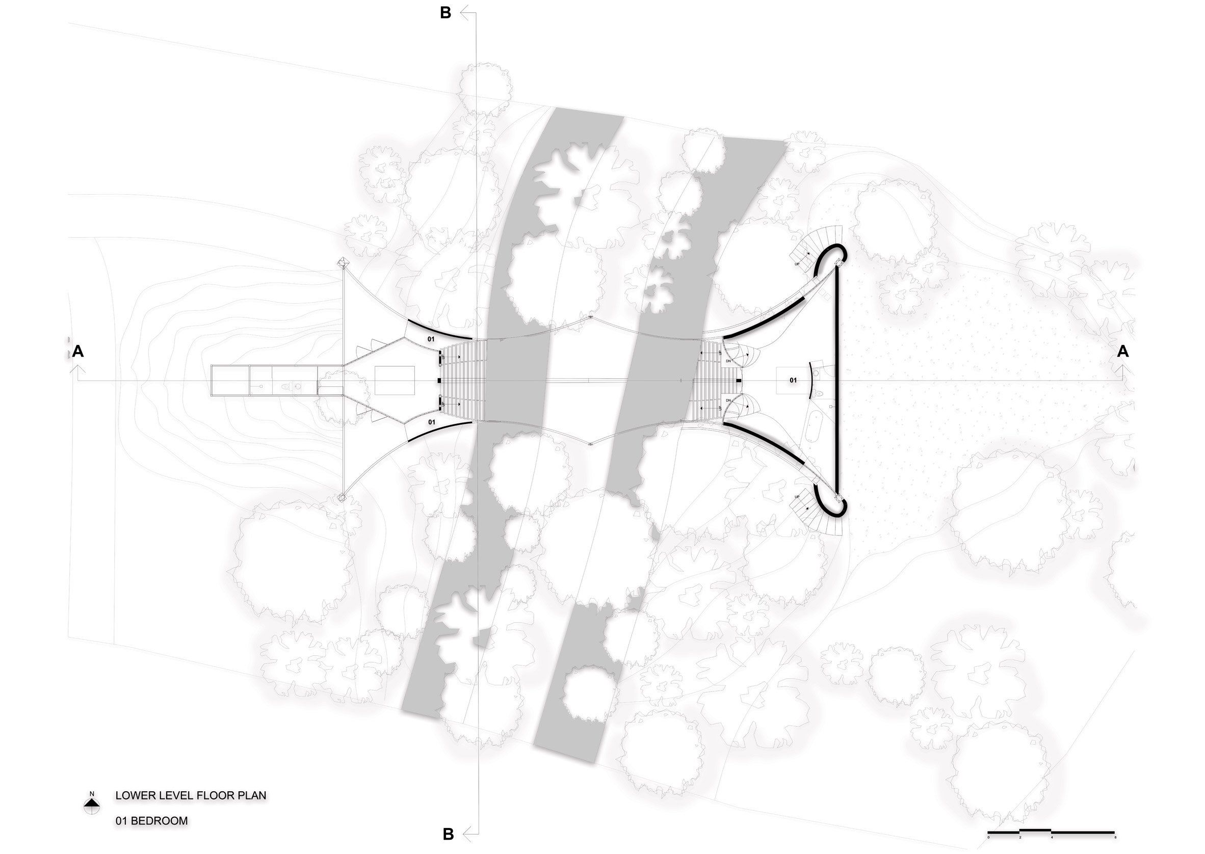 Дві двоповерхові кутові споруди на обох кінцях моста містять спальні, а кухня та їдальня розташовані в заскленій споруді, схожій на ніс корабля, з якої відкривається вид на трикутний басейн та сусідній ліс.