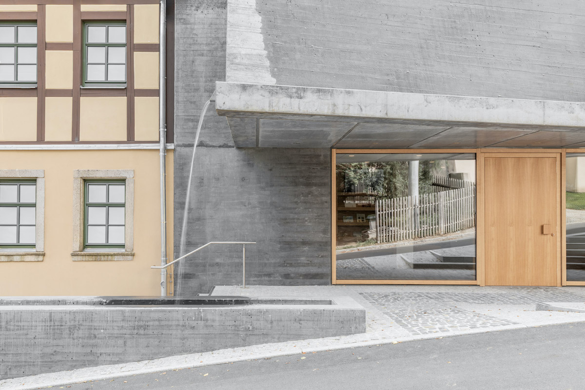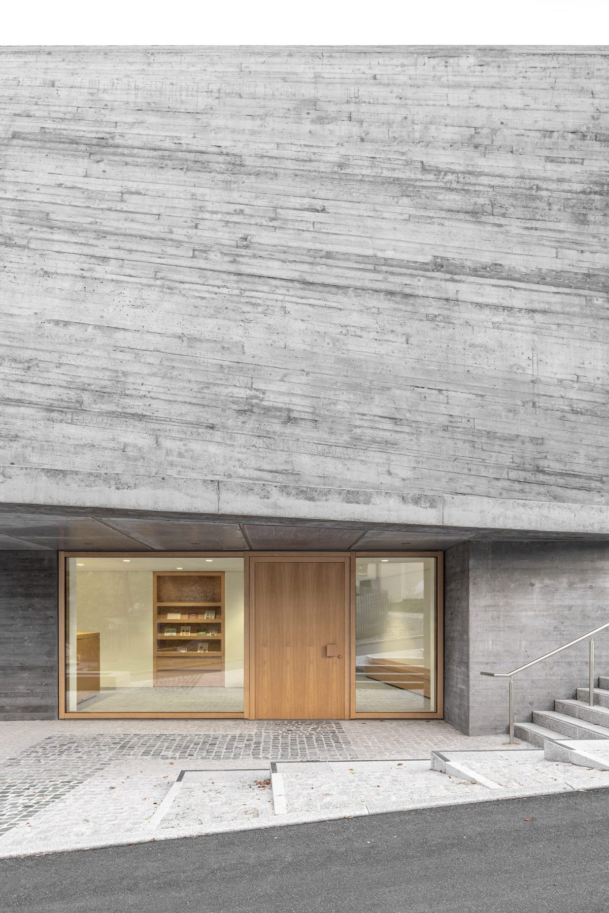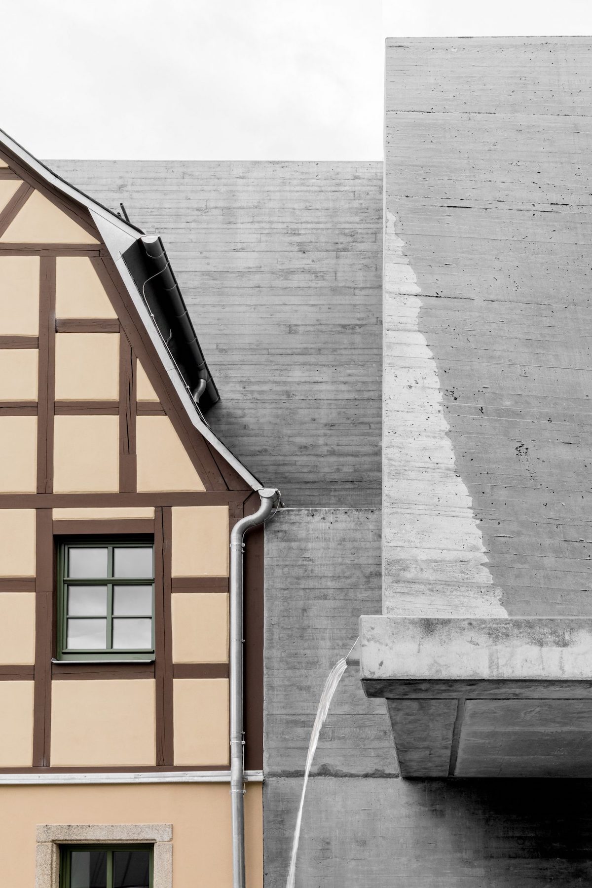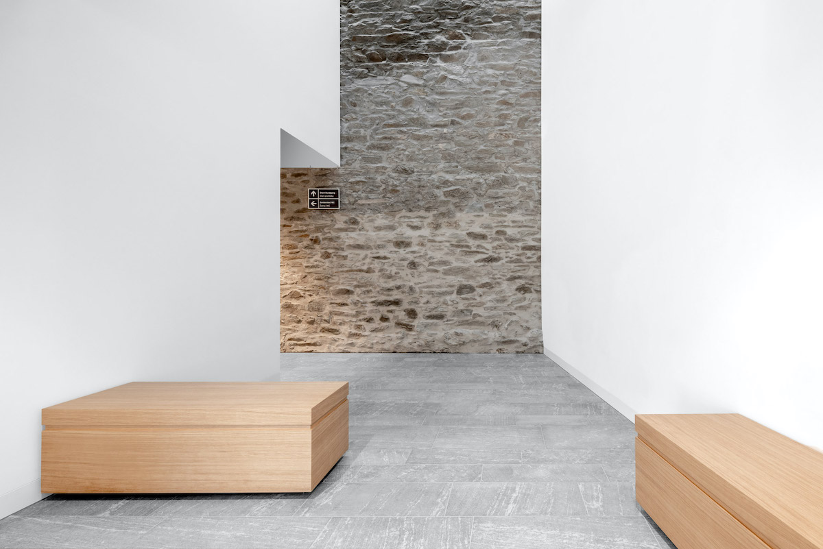Білі поверхні інтер’єру контрастують із грубим бетонним фасадом. Одна зі стін оголює частину середньовічного міського муру.