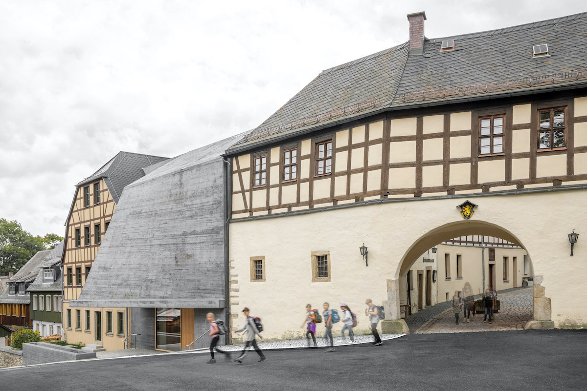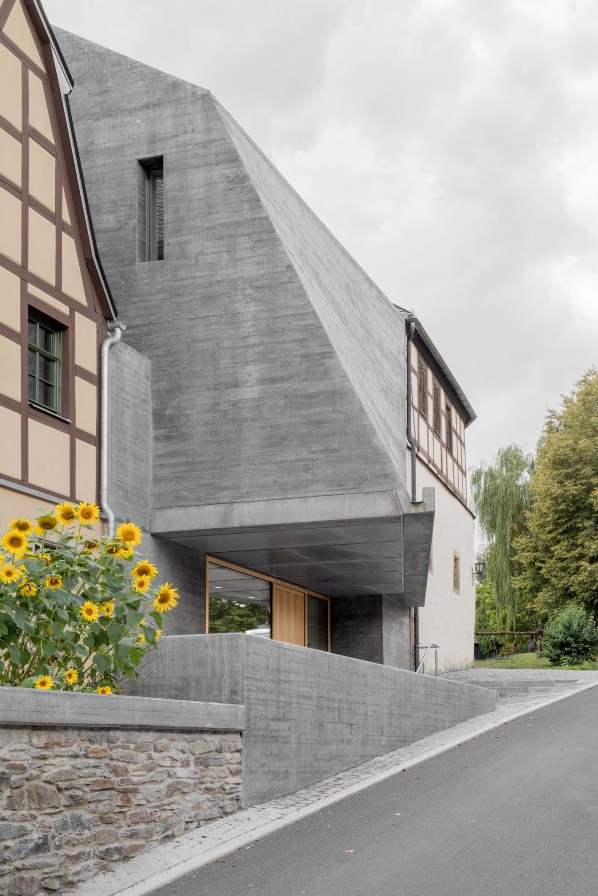 У німецькому місті Адорф збудували Музей перламутру у вигляді масивного бетонного об’єму неправильної форми, затиснутого між двома старовинними будинками.