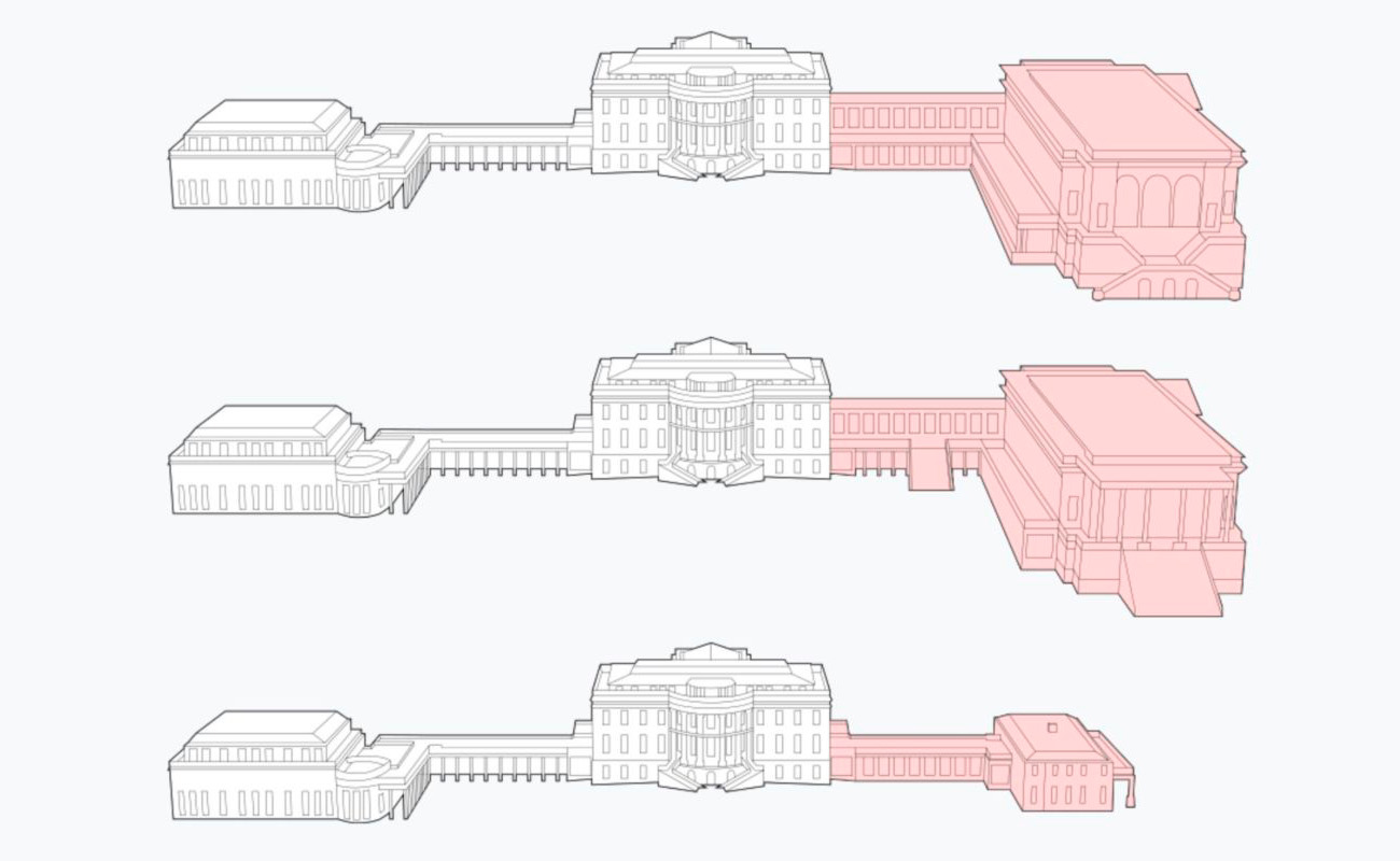Перше, на що звертають увагу архітектори, - це непропорційний масштаб нового крила. Площа його поверхів на 60% перевищуватиме решту Білого дому. Весь кубічний об’єм, враховуючи значну висоту стель, зробить нову споруду втричі більшою за решту резиденції.