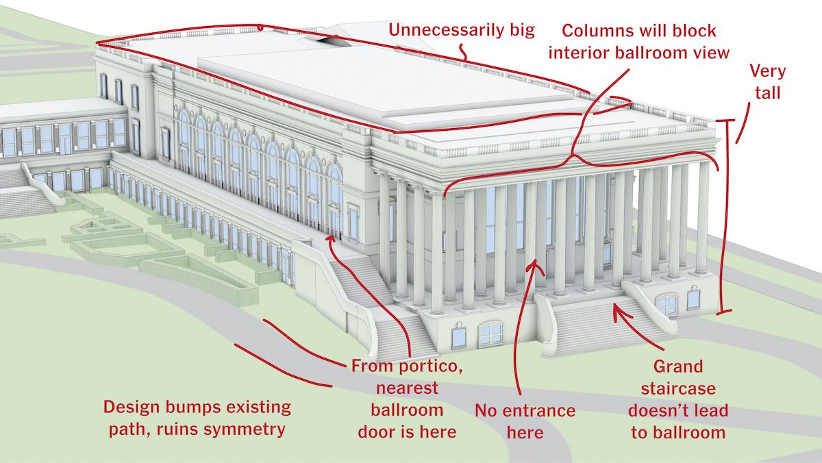 Проєкт нового Східного крила Білого дому з залою урочистостей було розроблено і схвалено поспіхом, і вся архітектурна концепція видається непродуманою та нелогічною, вважають архітектори, опитані The New York Times.