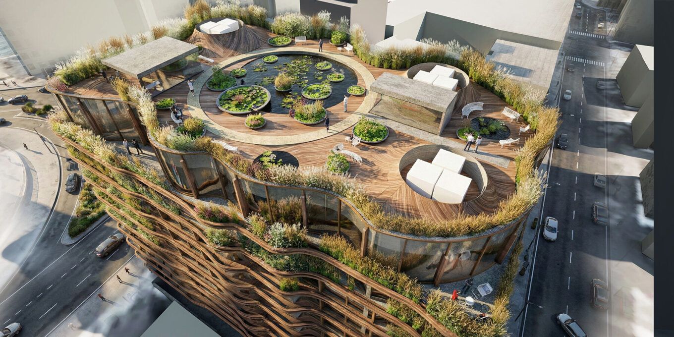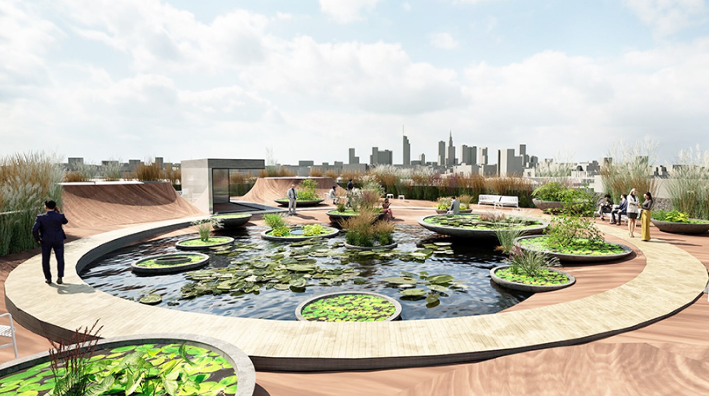 Дах будівлі запроєктований як гідроботанічний ландшафт із резервуарами для води, озелененням та спільними громадськими просторами. Великий водний басейн інтегрований у загальну систему пасивного охолодження, а технічне обладнання винесено під землю, щоб звільнити дах для користувачів.