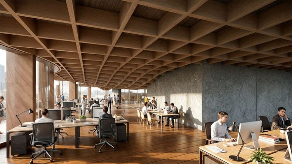 Крім того, проєкт передбачає додатковий поверх із дерев’яної вафельної плити з відкритими колонами. Це створює гнучкий простір, який можна використовувати як офіси або зони для подій та відпочинку.