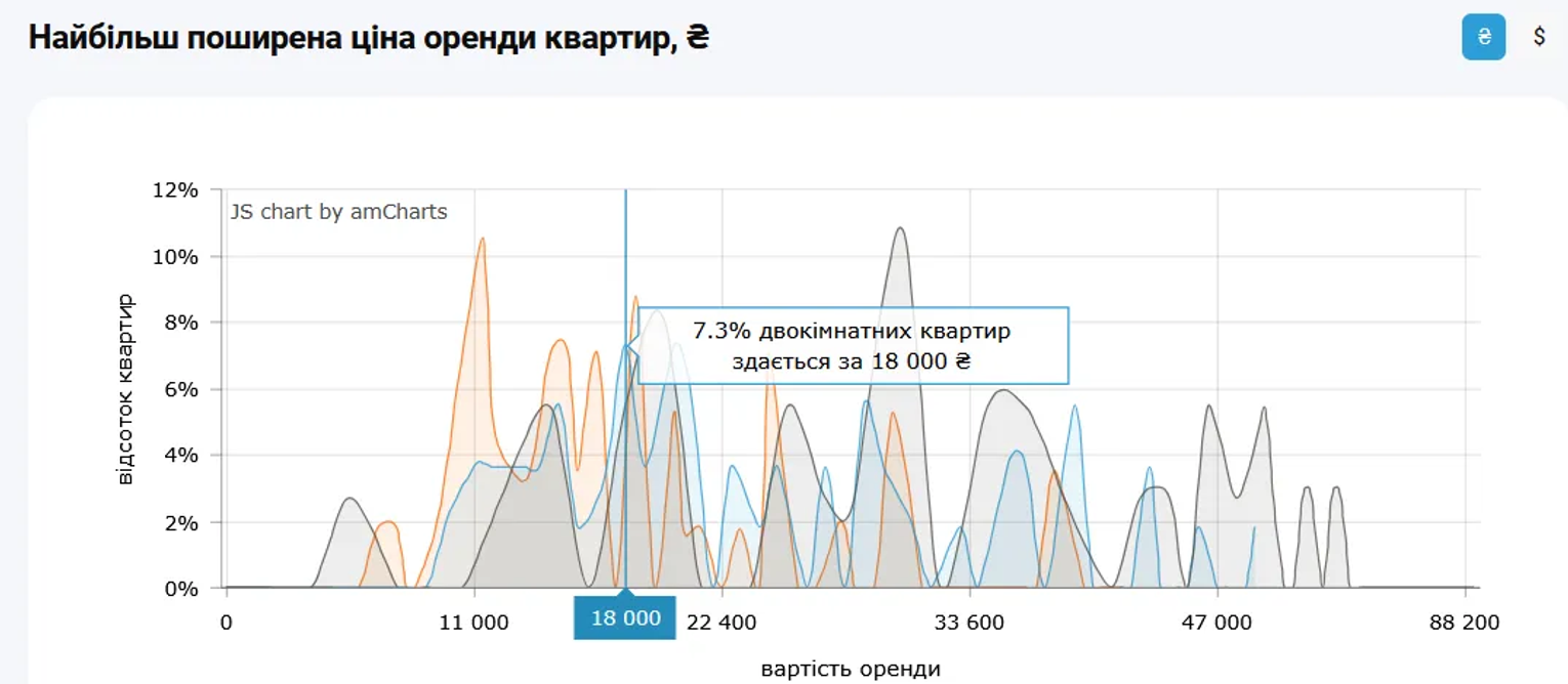2-кімнатні квартири у Києві найчастіше здають по 18 тис. та 20 тис. грн. Таких оголошень 7,3%.