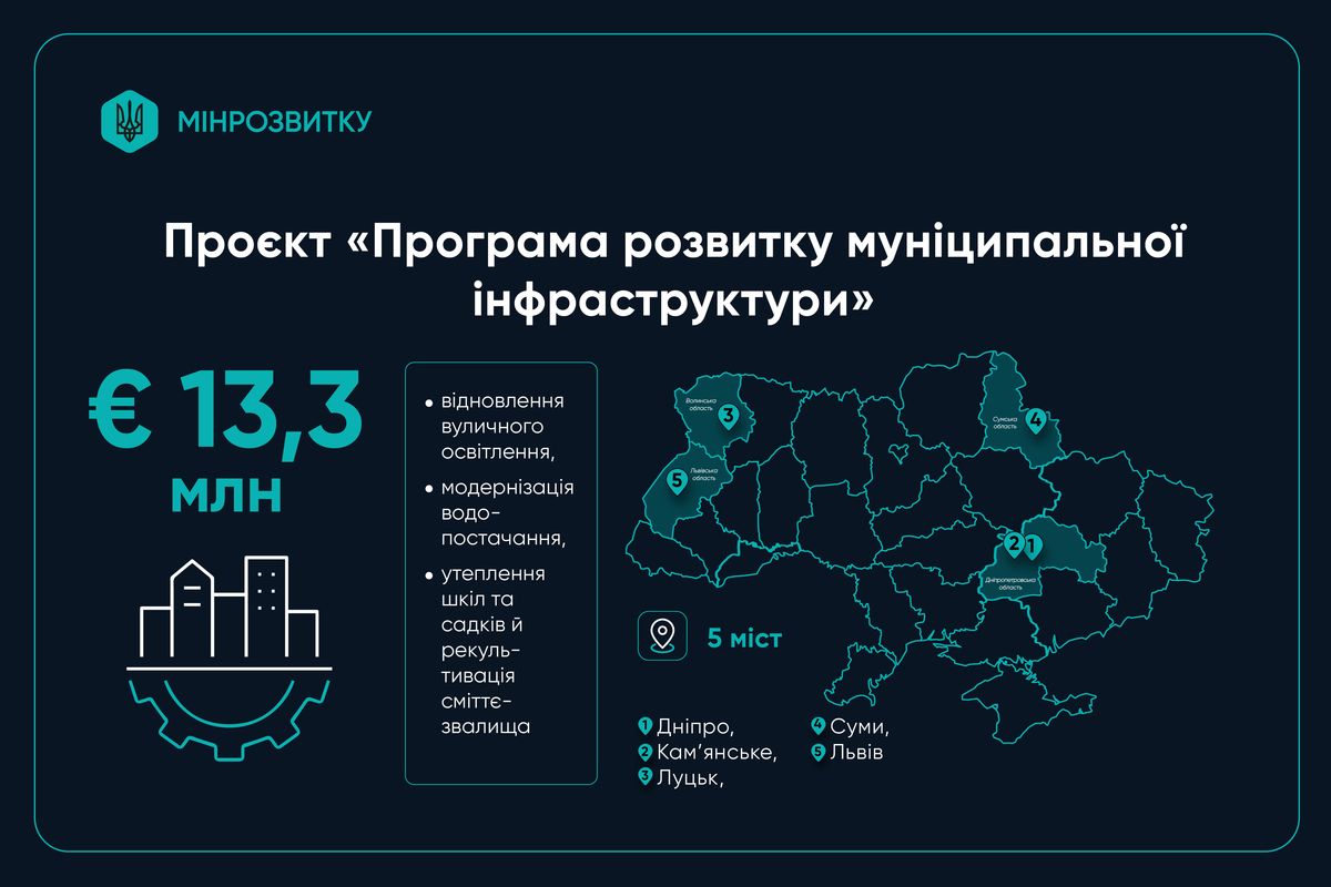 Фінансування розподілено між чотирма ключовими проєктами, які будуть впроваджуватися у Дніпрі, Кам'янському, Ковелі, Кременчуці, Києві, Луцьку, Львові, Миколаєві, Рівному, Тернополі, Ужгороді, Запоріжжі та Кореці, а саме:
