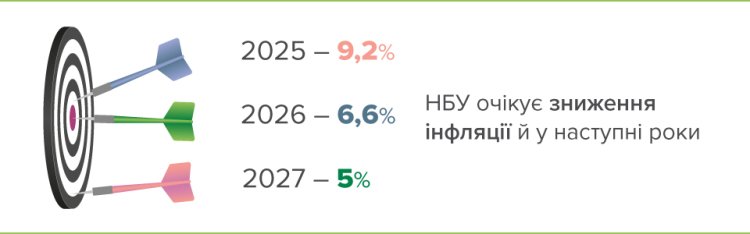 Згідно з прогнозами НБУ, наприкінці 2025 року інфляція опуститься нижче 10%, у 2026 році – стане меншою за 7%, а в подальшій перспективі поступово наближатиметься до цільового показника у 5%.