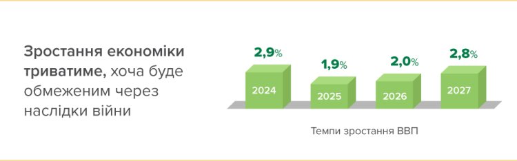 Водночас посилення російських атак спричинило значні пошкодження енергосистеми, що призвело до дефіциту електроенергії та стримуватиме економічне зростання найближчим часом. Позитивний вплив на економіку матимуть значні бюджетні витрати та міжнародна фінансова підтримка. За прогнозом НБУ, у 2025 році економіка зросте майже на 2%, а в наступні роки – на 2–3% щорічно.