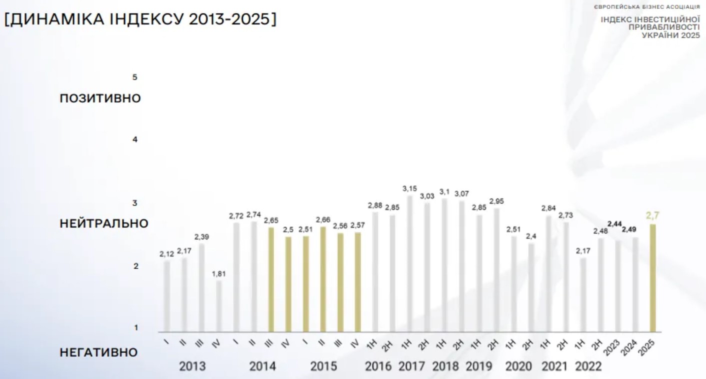 Загалом інтегральний показник індексу інвестиційної привабливості України у 2025 році дещо зріс і склав 2,70 бала з п'яти можливих (2,49 бала у 2024 році).