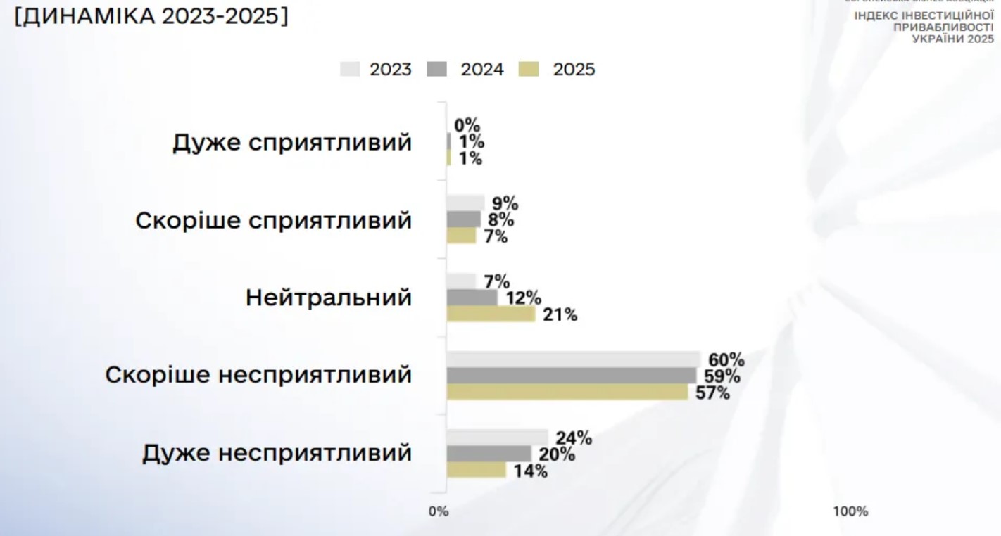 Кількість компаній, котрі вважають інвестиційний клімат в Україні несприятливим, поступово зменшується: 71% у 2025 році проти 79% у 2024-му і 84% у 2023-му. Вкрай несприятливим його вважають 14% (20% – у 2024 році). Водночас 21% респондентів оцінює інвестклімат як нейтральний, а 8% – як сприятливий.
