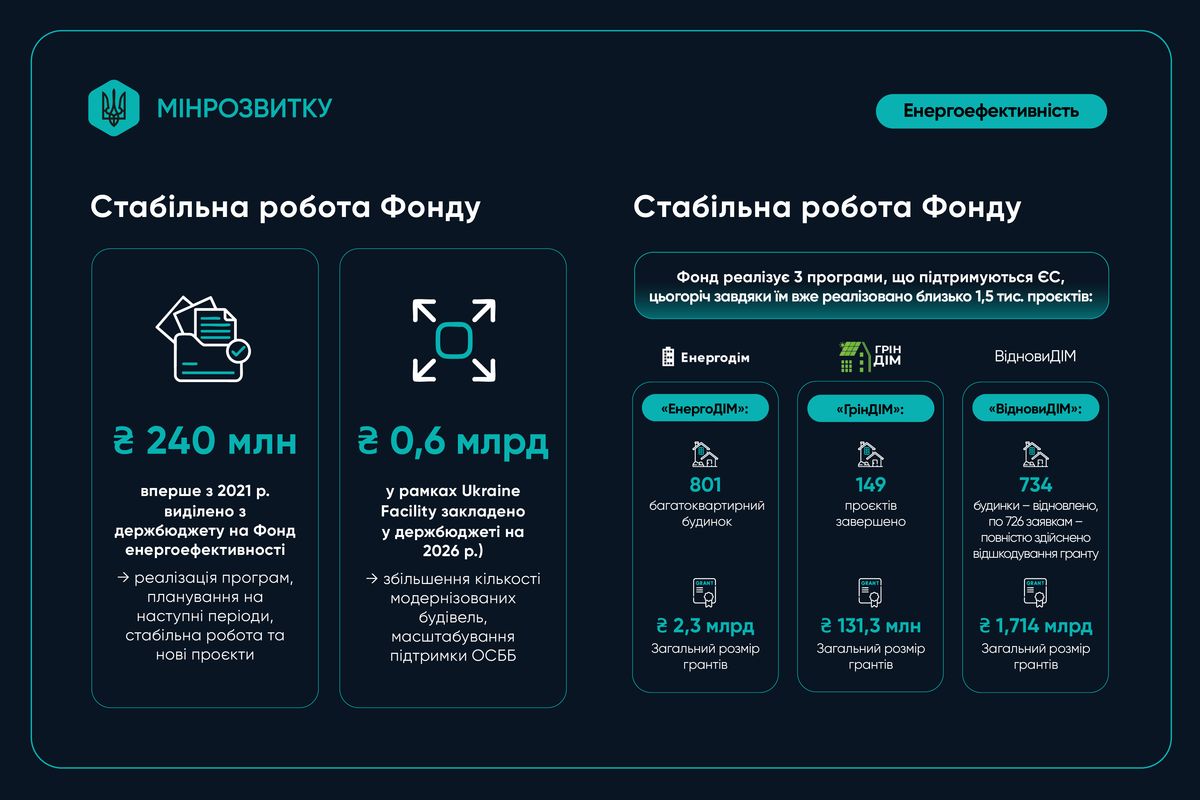 Додатково, у рамках Ukraine Facility, у державному бюджеті на 2026 рік закладено 0,6 млрд грн на підтримку Фонду. Завдяки цьому Фонд зможе збільшити кількість модернізованих будівель, у тому числі в регіонах, що постраждали від бойових дій.