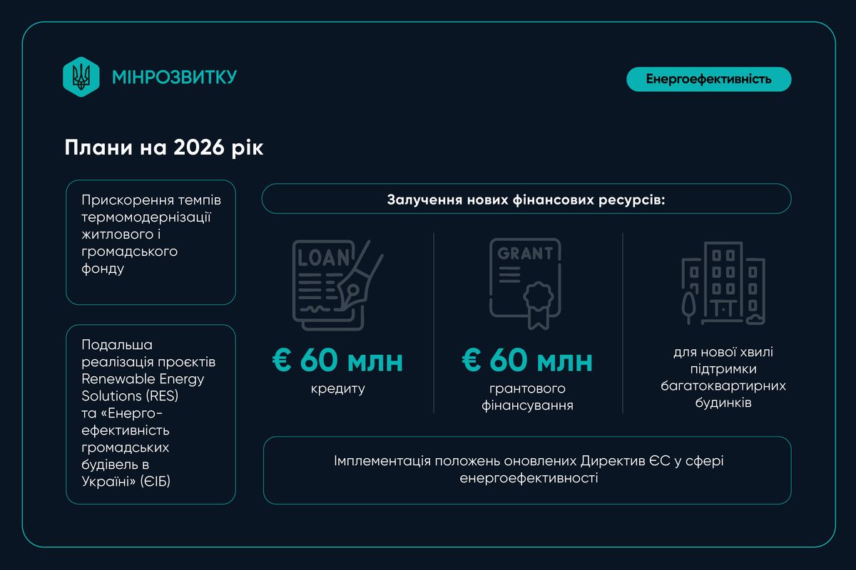У 2026 році Міністерство зосередить роботу на масштабуванні вже розпочатих програм та імплементації європейських вимог у сфері енергоефективності. Ключовим завданням є прискорення темпів термомодернізації житлового і громадського фонду, зокрема, збільшення кількості проєктів, що впроваджуються за рахунок державних та міжнародних ресурсів.
