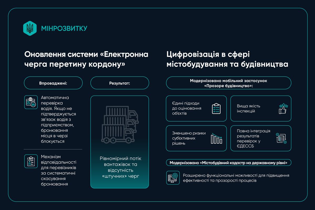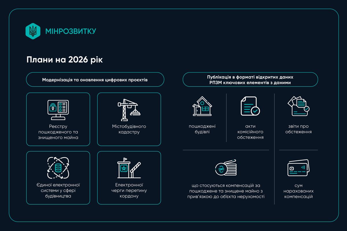 У 2026 році заплановано низку цифрових проєктів, які мають оновити та вдосконалити ключові державні електронні системи. Йдеться про модернізацію реєстру пошкодженого та знищеного майна, розвиток Містобудівного кадастру, оновлень Єдиної електронної системи у сфері будівництва, а також подальше вдосконалення електронної черги перетину кордону й інших сервісів, що працюють у сфері відповідальності Міністерства розвитку громад та територій України.