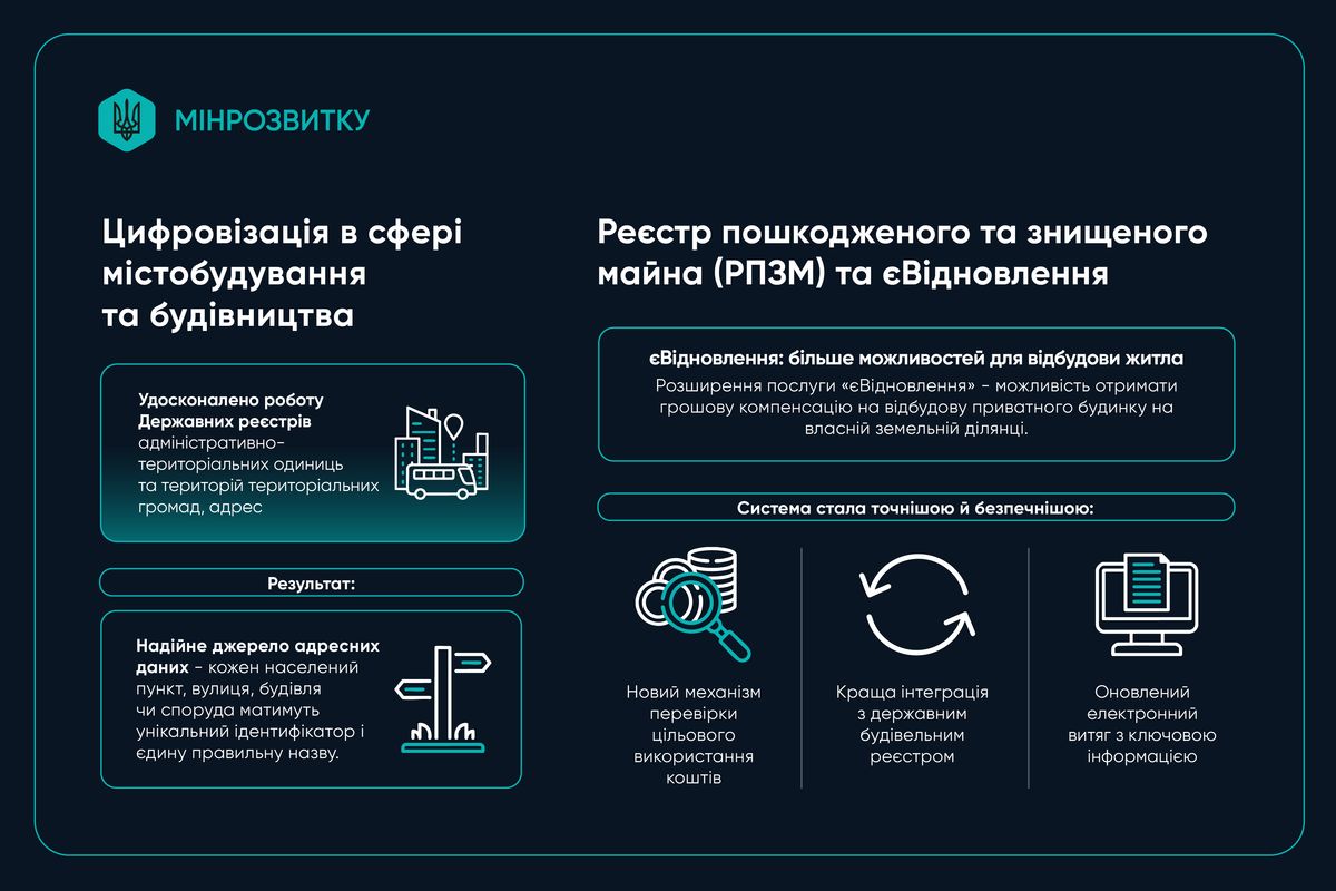 Передусім значно розширено можливості послуги єВідновлення, що стосується можливості отримати грошову компенсацію на відбудову приватного будинку на власній земельній ділянці. Система стала точнішою й безпечнішою завдяки новим механізмам перевірки того, як використовуються кошти, інтеграції з будівельним реєстром та появі нового електронного витягу з необхідною інформацією.