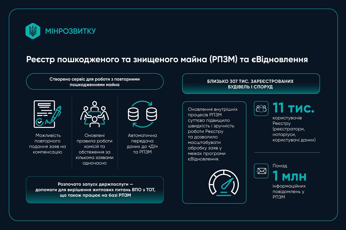 Також модернізовано мобільний застосунок «Прозоре будівництво». Завдяки оновленню запрацював чіткий, автоматизований та послідовний алгоритм перевірки, що забезпечує єдині підходи до оцінювання об’єктів, підвищує якість інспекцій, зменшує ризики суб’єктивних рішень і сприяє повній інтеграції результатів перевірок у «Єдиній державній електронній системі у сфері будівництва» (ЄДЕССБ).У 2025 році робота над модернізацією Реєстру пошкодженого та знищеного майна (РПЗМ) була зосереджена на покращенні вже наявних сервісів і запуску нових можливостей для людей, чиє житло постраждало внаслідок війни.