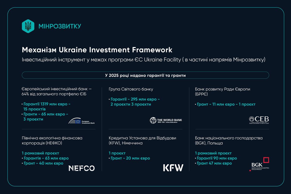 Довідково. Механізм Ukraine Investment Framework (UIF) - інвестиційна компонента програми Ukraine Facility від Європейського Союзу. Це ключовий інструмент ЄС, покликаний мобілізувати фінансування для реалізації проєктів з відбудови та розвитку. Роботу UIF координує Єврокомісія, а Уряд України визначає національні пріоритети за  та  має статус спостерігача при відборі проєктів.