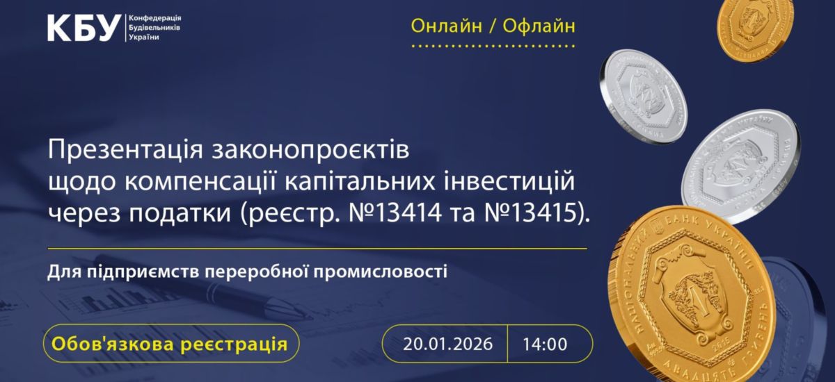 20 січня 2026 року відбудеться презентація законопроєктів №13414 та №13415, які пропонують механізм компенсації капітальних інвестицій через податкові інструменти. Це - практичні рішення для бізнесу, що інвестує у виробництво в Україні. Читати