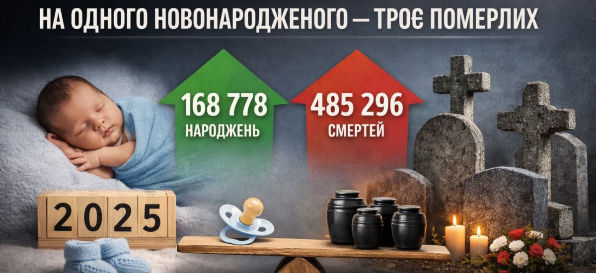 Згідно зі статистикою, смертність в Україні у 2025 році перевищила народжуваність у три рази, проте смертність зменшилась на 2%, а падіння народжуваності у порівнянні з 2024-м сповільнилось