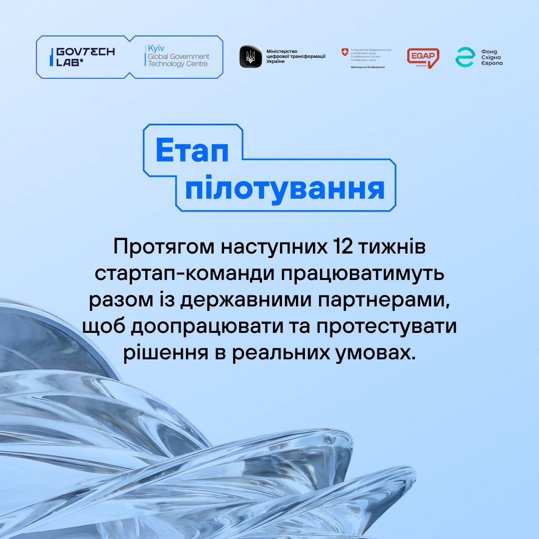 GovTech Lab Ukraine - це програма відкритих інновацій у сфері державних технологій, яку реалізує Global Government Technology Centre Kyiv (GGTC), за сприяння Міністерства цифрової трансформації України, Всесвітнього економічного форуму та за підтримки швейцарсько-української програми EGAP, яку реалізує Фонд Східна Європа. Більше інформації про програму GovTech Lab можна знайти за посиланням: https://www.kyivgovtechcentre.org/govtech-lab