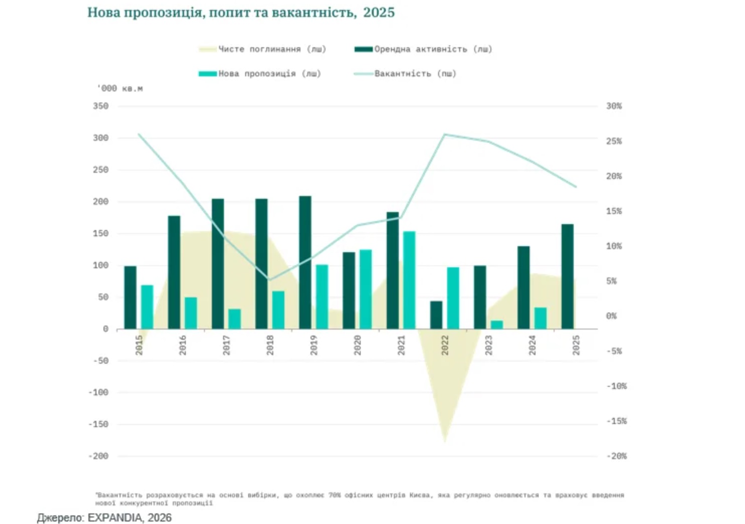 Однак більш стабільний і довгостроковий попит від таких компаній, в основному спрямовувався на придбання нерухомості, а не на оренду, що зумовлено підвищеними безпековими ризиками для сегменту. Загалом, попри зростання обсягів попиту у 2025 році, ринкова активність і надалі значною мірою формувалася на фоні дестабілізації, тоді як відносна стабільність забезпечувалася радше адаптивністю та вимушеними рішеннями орендарів, ніж повноцінною нормалізацією економічної активності.