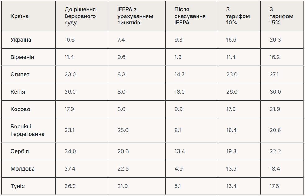 Водночас деякі країни регіону суттєво виграли від нового режиму. Митне навантаження для Боснії й Герцеговини та Сербії скоротилося одразу на 12 відсоткових пунктів, для Молдови – на 9 в.п., для Тунісу – на 8 в.п. Це пов'язано з тим, що раніше ці країни мали значно вищі індивідуальні тарифи за IEEPA, які тепер замінені єдиною плоскою ставкою.