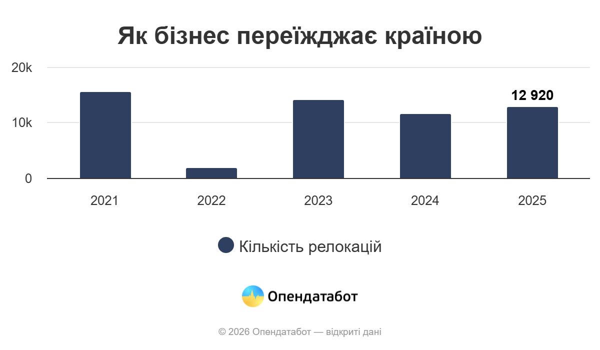 Найбільше релокацій у 2025 році бізнес здійснив саме з Києва - 12 558. Зі столиці підприємства переїжджали в Київську область, а також в інші регіони, повідомляє Опендатабот.