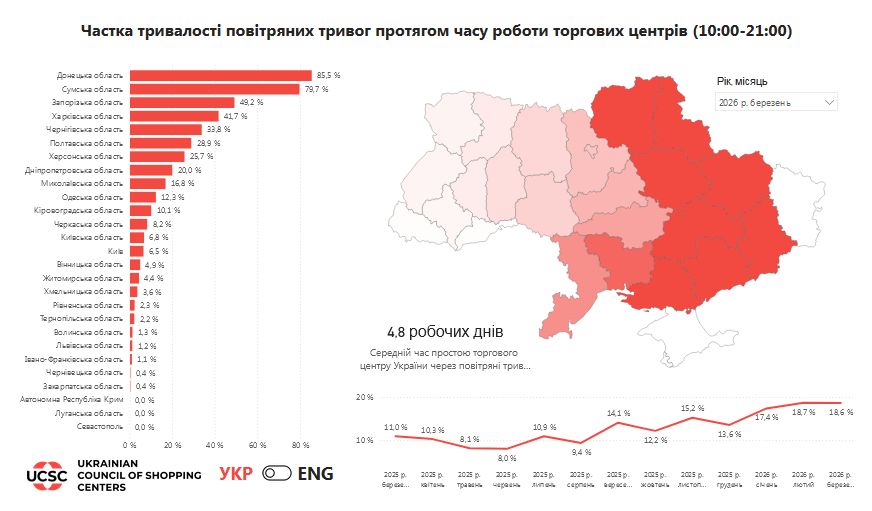 У березні 2026 року частка тривалості повітряних тривог у робочий час торгових центрів склала 18,6%, що на 7,6% більше порівняно з березнем минулого року (11%). В окремих регіонах, таких як Донецька та Сумська області, час простою перевищив 79% від загального графіку роботи.