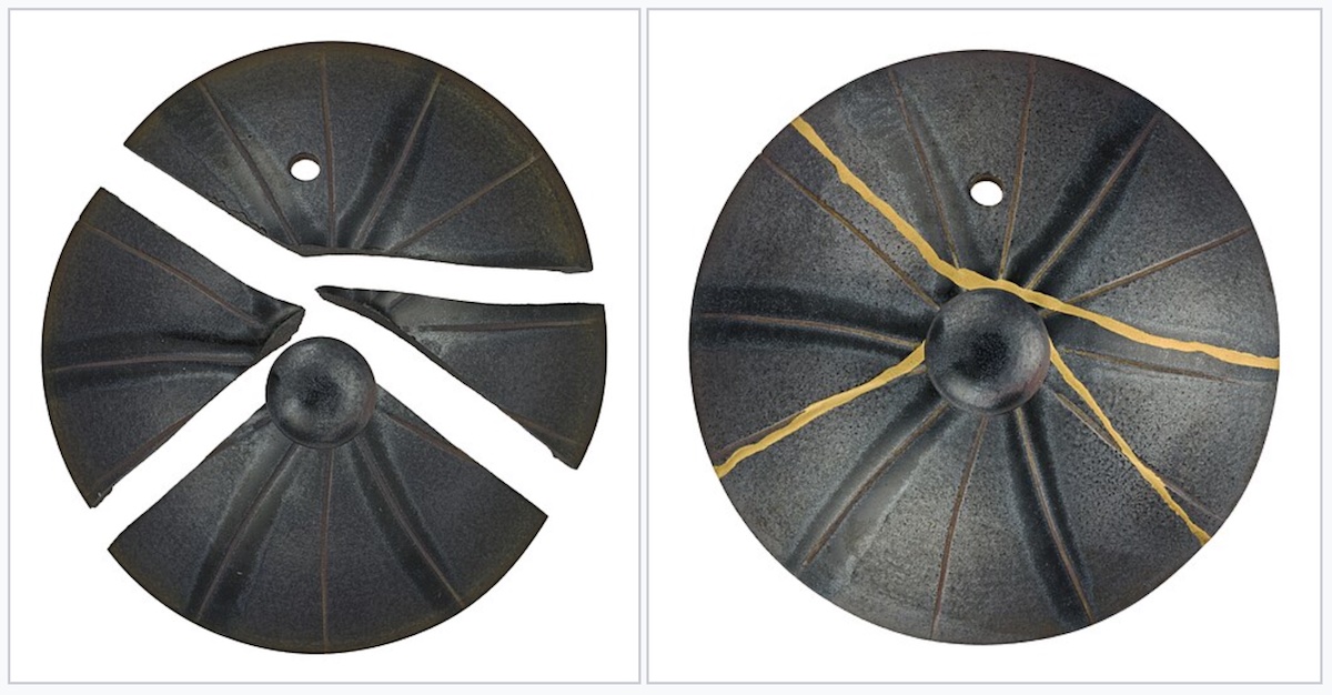 У традиційній японській техніці кінцугі фрагменти розбитої кераміки скріплюють за допомогою лаку й часто тріщини декоруються золотом чи сріблом.