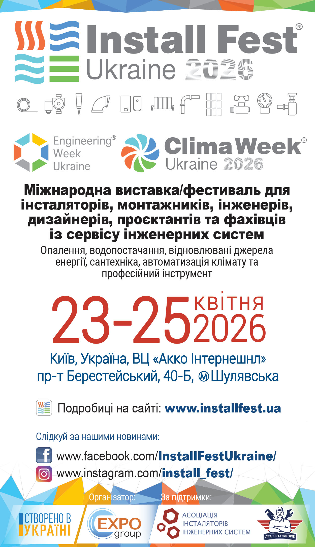 У 2026-му році в рамках виставки Install Fest Ukraine буде проходити Чемпіонат України серед інсталяторів інженерних систем опалення та водопостачання – Install Battle 2026. Відбудеться змагання за звання «Найкращий інсталятор України 2026 року»! Також чемпіонат стане практичною частиною для можливості підтвердження професійної кваліфікації для отримання професійного сертифіката!