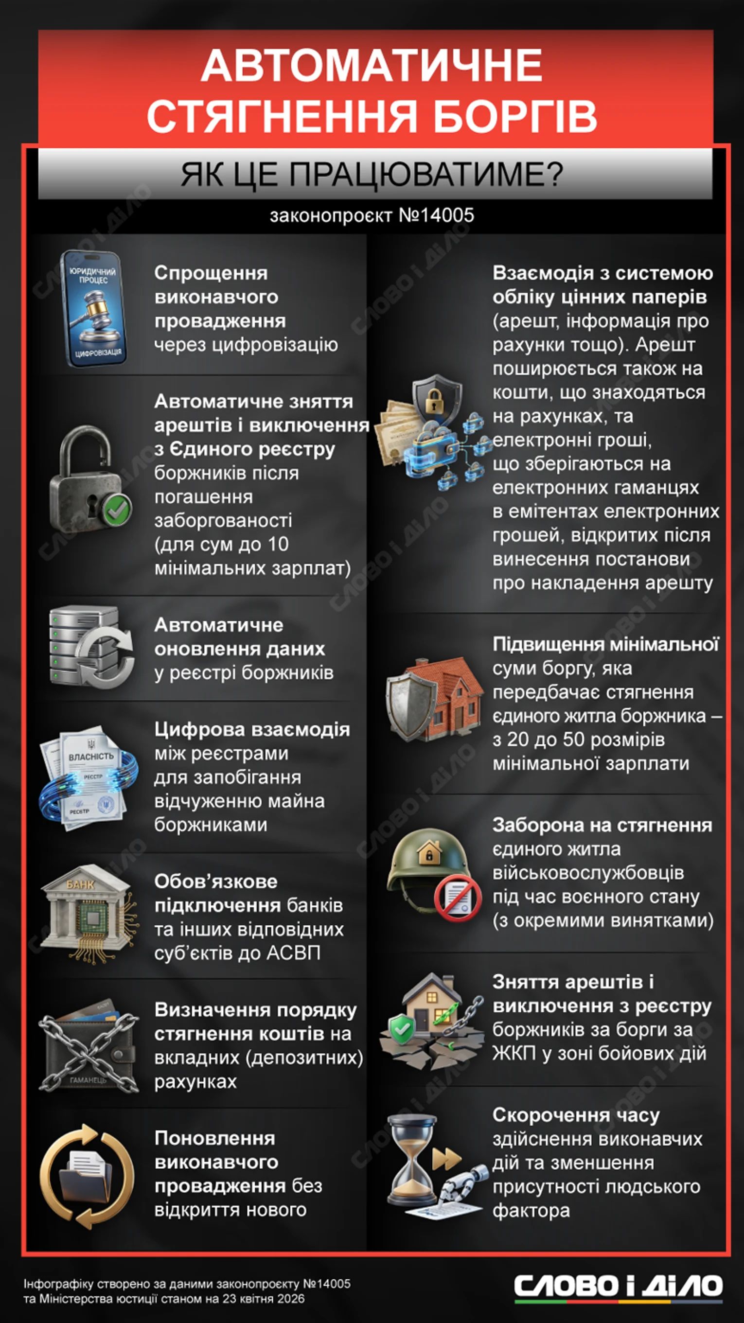 Весь процес виявлення, арешту й відчуження нерухомості тепер відбуватиметься в електронному вигляді та за допомогою автоматичної взаємодії між реєстрами. Таким чином, закон передбачає зменшення впливу людського фактору та запровадження прозорішої системи стягнення боргів.